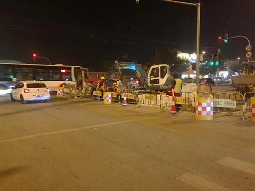 各管線橫穿濟微路的施工過程中,考慮到濟微路為南北交通主干道,本著“少封一米是一米”的施工理念,從減少交通影響,保證車輛和行人通行角度出發(fā),不但將施工全部安排在夜間10點之后,而且經(jīng)過反復優(yōu)化施工分區(qū),將原計劃半幅封閉縮小到逐車道封閉的方式進行,早6點高峰來臨前恢復交通。