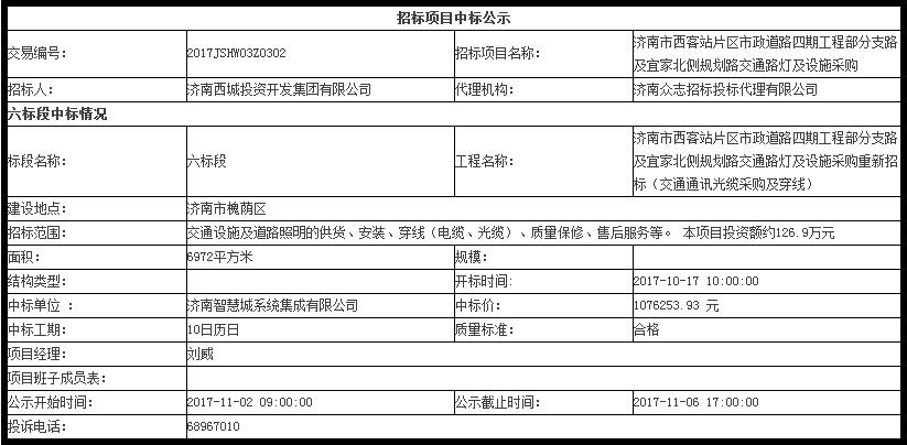 濟南市西客站片區(qū)市政道路四期工程采購中標公示