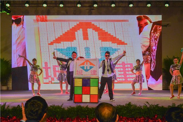 在歡快喜悅的歌舞《拜新年》中,匯演拉開(kāi)序幕,紅紅火火的舞臺(tái),映射著蒸蒸日上的發(fā)展勢(shì)頭。舞蹈《成長(zhǎng)》《奮進(jìn)》以激昂的音樂(lè),吹響了催人奮進(jìn)的號(hào)角,用動(dòng)感的舞步,舞出了城建鐵軍的蓬勃朝氣?!恶R路情緣》《鐵軍男相親記》《生日》《真相》《男爭(zhēng)女辯》《筑夢(mèng)同行》等語(yǔ)言類節(jié)目圍繞生產(chǎn)經(jīng)營(yíng)精心編排,真實(shí)感人,催人奮進(jìn)。勵(lì)志感人的歌曲,絢麗多彩的歌伴舞,酷炫的舞蹈,神秘的魔術(shù),魔幻的黑光劇,生龍活虎的京劇,讓觀眾著實(shí)過(guò)了一把眼癮,臺(tái)下掌聲不斷,歡欣喜悅的氣氛一浪高過(guò)一浪。小品里父母、妻子、孩子那一段段心里話,令人感同身受,潸然淚下,家屬們用實(shí)際行動(dòng)表達(dá)了對(duì)企業(yè)最大的理解和支持,大家在這個(gè)溫暖的大家庭中,以誠(chéng)相待,溫馨彼此。在激動(dòng)人心的歌舞串燒《開(kāi)創(chuàng)未來(lái)》中,匯演圓滿落下帷幕,集團(tuán)領(lǐng)導(dǎo)與演職人員合影留念。