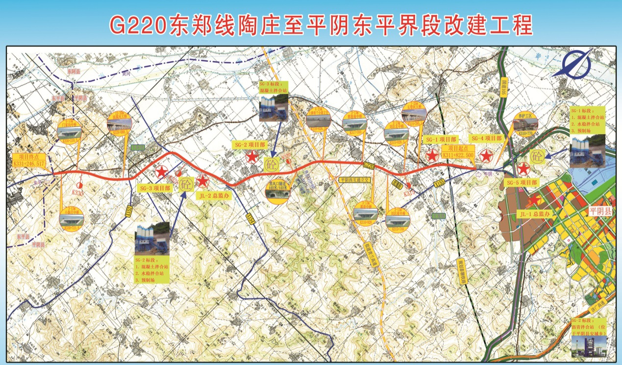 G220東鄭線陶莊至平陰東平界段改建工程項目位于濟南市平陰縣境內,路線全長19.424km,其中利用原路改建段16.635公里,新建段2.789公里。全線設大橋2座、中橋6座、小橋3座、涵洞53道、隧道440米/1座、分離立交1座,新建養(yǎng)護工區(qū)1處。全線采用雙向四車道一級公路標準,設計速度80公里/小時,路基寬度一般路段為24.5米;東阿鎮(zhèn)路段路基寬37米,設置非機動車道;隧道進出口分離路基路段路基寬12.25米,批準概算6.54億元,計劃總工期579天。