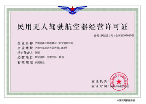 根據(jù)民航部門頒布的《民用無人駕駛航空器經(jīng)營性飛行活動管理辦法》及《無人機駕駛航空器飛行管理暫行條例》規(guī)定,濟南金衢公路勘察設計研究有限公司即刻選派人員參加無人機駕駛員培訓,于2018年8月16日獲得“中國民用航空華東地區(qū)管理局頒發(fā)的《民用無人駕駛航空器經(jīng)營許可證》”,公司員工李波同志獲得民用無人機駕駛員合格證和無人機超視距駕駛員合格證。