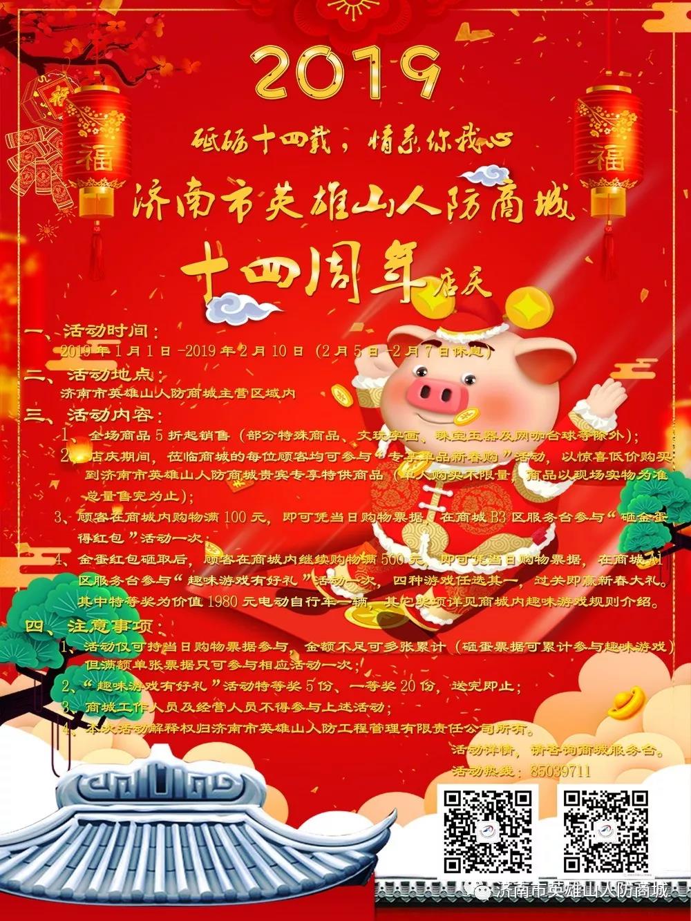 “十全十美,四海承平”。濟(jì)南市英雄山人防商城“相伴十四周年,共迎美好新年”主題十四周年店慶系列惠民活動將于二〇一九年元月一日正式啟動!
