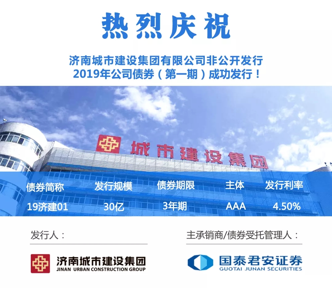 4月12日,濟(jì)南城市建設(shè)集團(tuán)非公開發(fā)行2019年公司債券(第一期)成功發(fā)行。濟(jì)南城市建設(shè)集團(tuán)公開市場(chǎng)首期債券在當(dāng)天完成簿記,并發(fā)布3月社會(huì)融資規(guī)模、進(jìn)出口數(shù)據(jù)超預(yù)期回暖的不利市場(chǎng)情緒中,成功發(fā)行30億元,債券期限為3年期,發(fā)行利率為4.5%(低于3年期貸款基準(zhǔn)利率4.75%)。