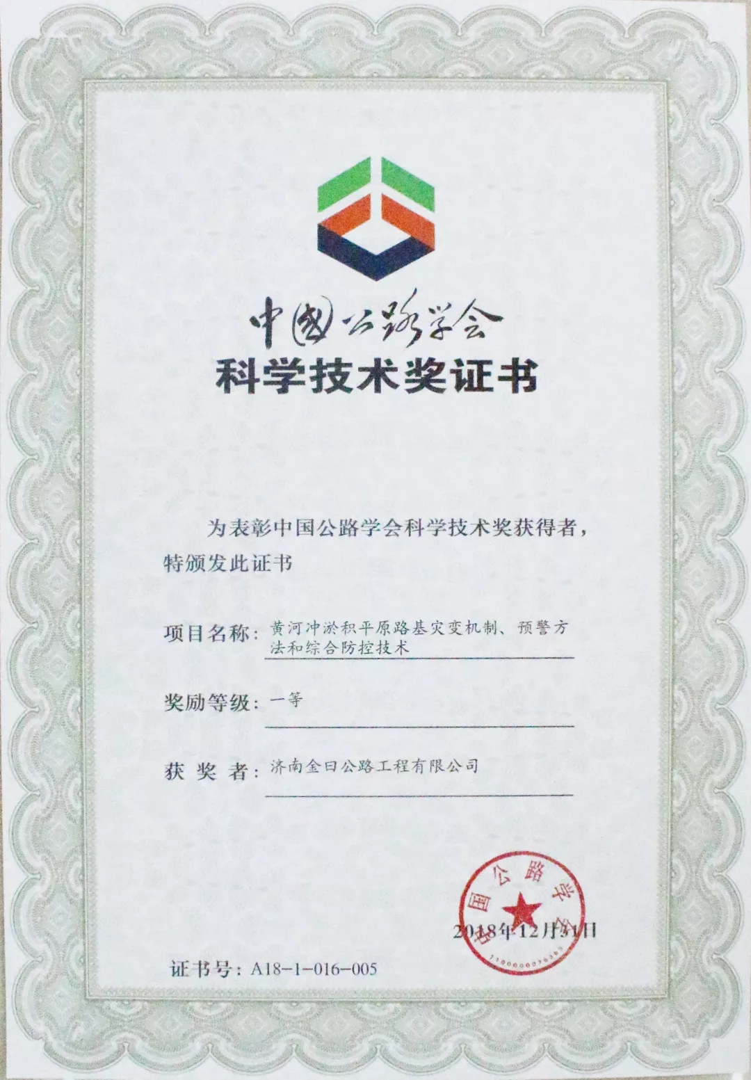 2019年6月15日,由中國公路學(xué)會組織的“2018年度中國公路學(xué)會科學(xué)技術(shù)獎頒獎大會”在北京國家會議中心召開。濟南金曰公路工程有限公司參與研究的課題《黃河沖淤積平原路基災(zāi)變機制、預(yù)警方法和綜合防控技術(shù)》榮獲一等獎。