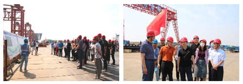 在鳳凰黃河大橋,項目負(fù)責(zé)人對鋼塔、鋼箱梁頂推和跨堤引橋施工以及安全、質(zhì)量、進(jìn)度、環(huán)保和疫情防控等情況進(jìn)行了介紹,支部成員進(jìn)行了現(xiàn)場參觀。