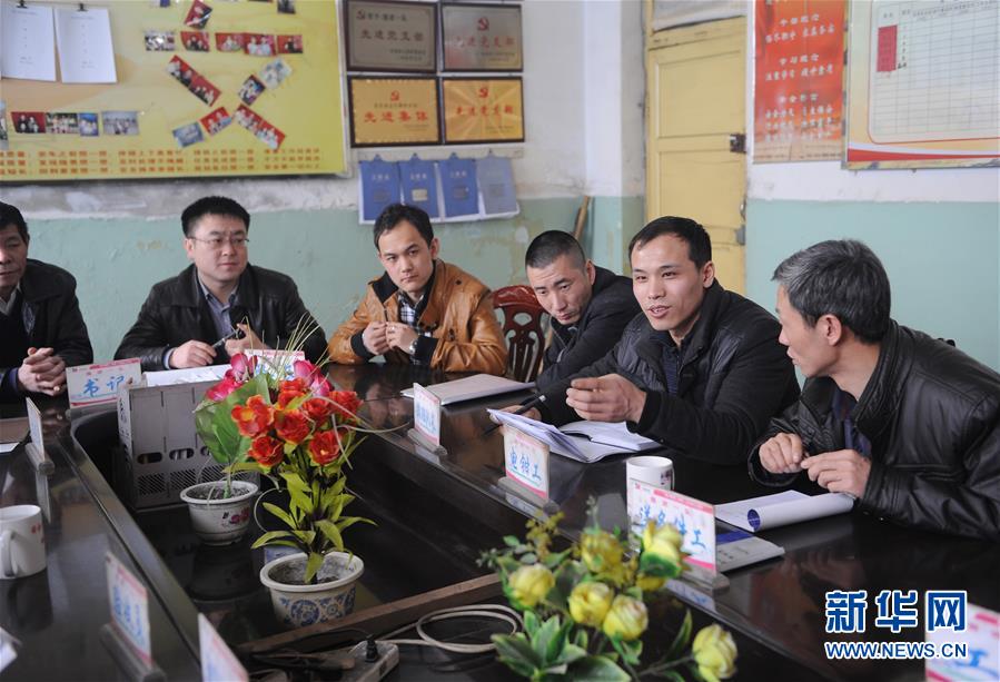 全國(guó)人大代表、山西焦煤西山煤電杜兒坪煤礦的董林(右二)在和工友們座談(2013年2月26日攝)。新華社記者燕雁攝
