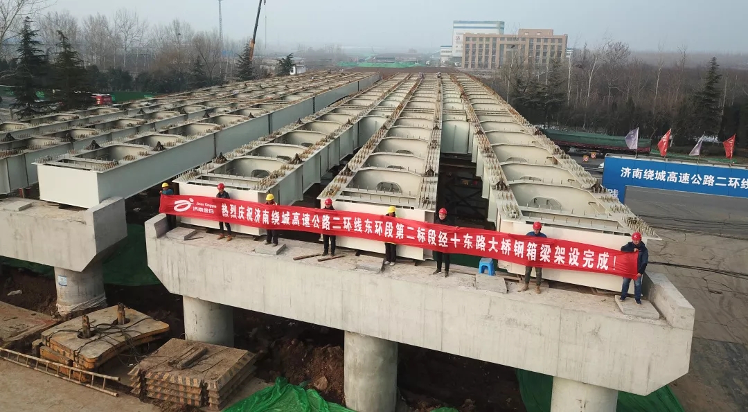 1月18日,濟(jì)南繞城高速公路二環(huán)線東環(huán)段二標(biāo)段(濟(jì)南“大東環(huán)”)互通主線橋跨經(jīng)十路鋼箱梁順利合攏。至此,項(xiàng)目跨越經(jīng)十東路大橋鋼箱梁架設(shè)工作全部完成,為實(shí)現(xiàn)年底通車的目標(biāo)打下了良好基礎(chǔ)。