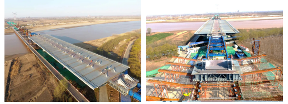 北岸280m跨鋼箱梁總拼完成,正在由南向北進行頂推,累計前進380米。