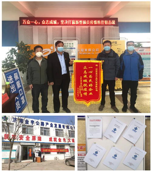 疫情來(lái)勢(shì)洶洶,在嚴(yán)峻條件下金曰公司、金宇公司等項(xiàng)目部主動(dòng)出擊,儲(chǔ)備防疫物資,制作宣傳標(biāo)語(yǔ),協(xié)調(diào)人員調(diào)度,一手抓防疫,一手抓復(fù)工,堅(jiān)持“兩手抓”,奪取“雙勝利”。金曰公司項(xiàng)目部為沿線(xiàn)的8個(gè)村莊和濟(jì)菏高速收費(fèi)站捐獻(xiàn)了生活必需品、防疫物資,協(xié)助當(dāng)?shù)劓?zhèn)政府開(kāi)展疫情防控工作,積極承擔(dān)社會(huì)責(zé)任。
