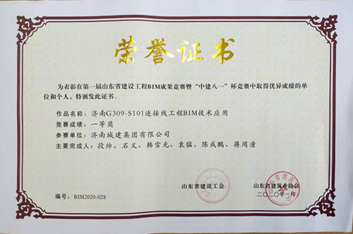 近日,山東省建筑業(yè)協(xié)會(huì)舉辦第一屆山東省建設(shè)工程BIM成果競(jìng)賽暨“中建八一”杯BIM競(jìng)賽公開(kāi)答辯和競(jìng)賽成果交流會(huì),濟(jì)南城建集團(tuán)有限公司攜1項(xiàng)作品“濟(jì)南G309-S101連接線工程BIM技術(shù)應(yīng)用”參加。經(jīng)過(guò)技術(shù)人員匯報(bào)、答辯與專(zhuān)家評(píng)選,城建集團(tuán)參賽作品最終榮獲一等獎(jiǎng)。