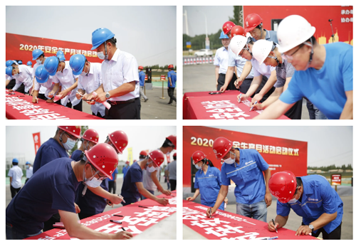 儀式結(jié)束后,參加儀式的全體人員在印有“消除事故隱患,筑牢安全防線”安全主題條幅上進行簽名。
