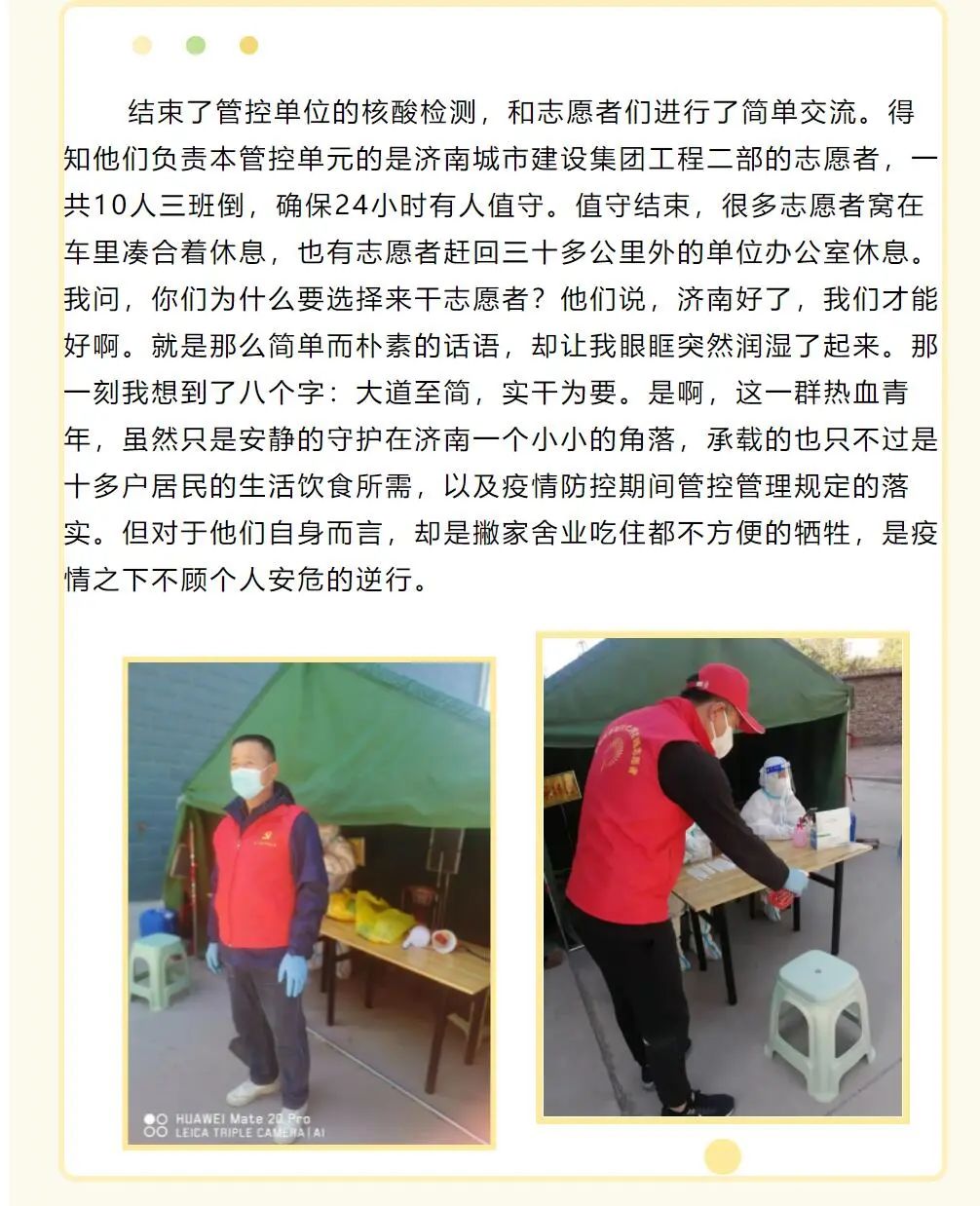 “他們說,濟南好了,我們才能好啊。簡單而樸素的話語,卻讓我眼眶突然潤濕了起來,那一刻我想到了八個字:大道至簡,實干為要。”近日,歷城區(qū)董家街道辦的工作人員在“愛董家”微信平臺上寫下了這樣的話,他口中的“他們”便是按照集團統(tǒng)一部署下沉到董家街道社區(qū)的工程二部志愿者們。
