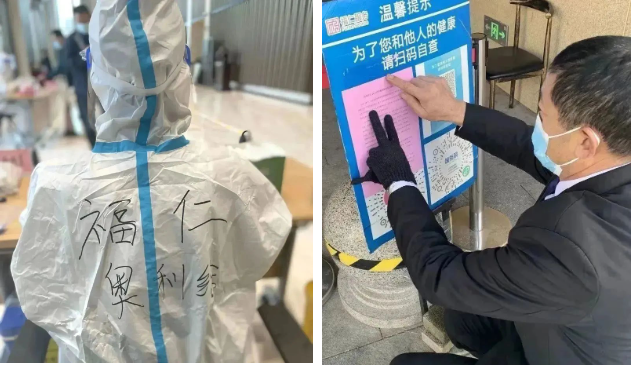 當(dāng)柏然公館項(xiàng)目收到業(yè)主需要居家隔離的通知,福仁服務(wù)人員身穿防護(hù)服,上門(mén)耐心溝通安撫,“遇到事情需要代辦的,東西需要代買(mǎi)的,隨時(shí)打電話找我們!我們24小時(shí)為你開(kāi)機(jī)!”