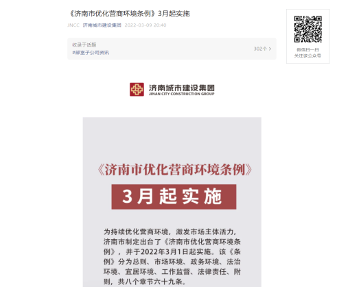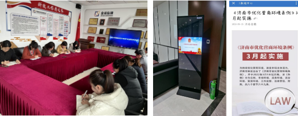 《濟(jì)南市優(yōu)化營(yíng)商環(huán)境條例》(以下簡(jiǎn)稱《條例》)于今年3月1日起施行,根據(jù)市國(guó)資委《關(guān)于開展優(yōu)化營(yíng)商環(huán)境法治宣傳月活動(dòng)的通知》要求,為貫徹實(shí)施好《條例》,持續(xù)優(yōu)化營(yíng)商環(huán)境,3月4日-31日,集團(tuán)及各子公司積極開展了優(yōu)化營(yíng)商環(huán)境法治宣傳月活動(dòng)?;顒?dòng)期間,集團(tuán)在微信公眾號(hào)推送《<濟(jì)南市優(yōu)化營(yíng)商環(huán)境條例>3月起實(shí)施》推文,同時(shí)通過電子屏投放、制作易拉寶等多種形式進(jìn)行宣傳,不斷強(qiáng)化干部職工優(yōu)化營(yíng)商環(huán)境的理念,營(yíng)造良好輿論氛圍。