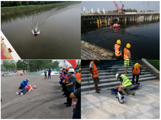 應(yīng)急響應(yīng)啟動(dòng)后,各小組隊(duì)員全部到崗到位。第一組進(jìn)行堤壩加固,確保堤壩安全,防止?jié)⒌?;第二組負(fù)責(zé)拋投救生圈,進(jìn)行落水人員的救援;第三組乘坐救援沖鋒舟對(duì)落水人員進(jìn)行救援,將落水人員打撈上岸;落水人員上岸后,由醫(yī)療救護(hù)組進(jìn)行現(xiàn)場(chǎng)急救,并由救護(hù)組轉(zhuǎn)運(yùn)至醫(yī)院進(jìn)行下一步治療。