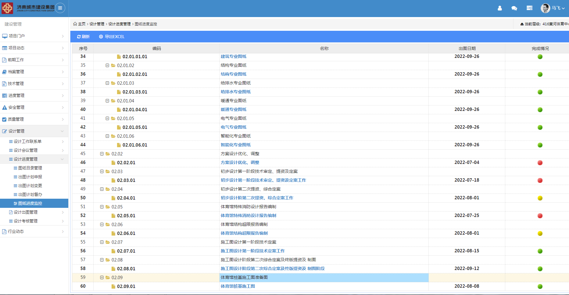 為進一步強化設計源頭管理,克服設計過程環(huán)節(jié)多、線下管控難度較大的實際,工程四部OA信息平臺開發(fā)研制設計管理業(yè)務功能模塊并在黃河體育中心項目全面應用。通過設計管理業(yè)務功能模塊,實現出圖計劃、圖紙上傳、分發(fā)簽收、圖紙會審、變更、圖紙文檔的統(tǒng)一編碼與存檔,有效提升設計管理中工作任務安排、接收及出圖計劃整體把控。