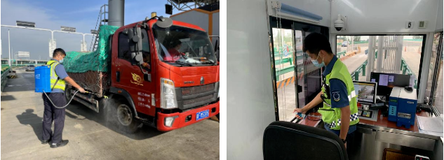收費(fèi)員加固防撞桶并對工作現(xiàn)場進(jìn)行消殺