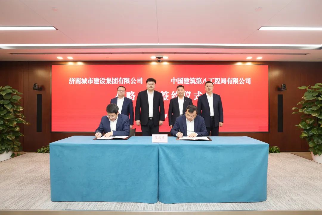 在與會領導的共同見證下,劉書冬、張建分別代表中建八局與濟南城市建設集團簽署戰(zhàn)略合作協(xié)議。根據(jù)協(xié)議,雙方將進一步整合要素資源,完善溝通機制,在基礎設施建設、片區(qū)綜合開發(fā)、城市更新及運營等領域深化合作,共同推進高質(zhì)量發(fā)展和濟南強省會建設。