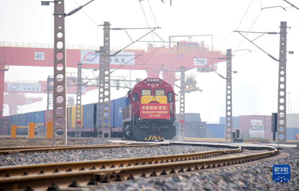 滿載日用百貨的X8151次中歐班列從西安國(guó)際港站駛出,開往白俄羅斯首都明斯克(2023年2月1日攝)。新華社記者 李一博 攝