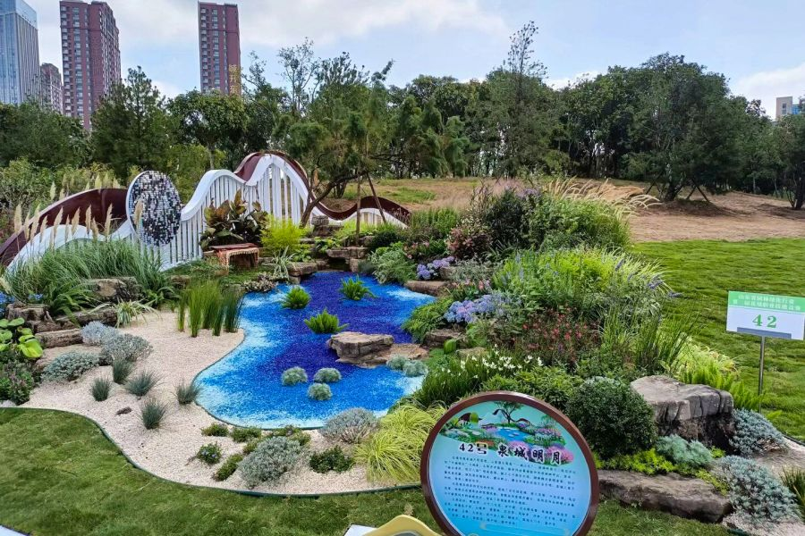 森泰園林參賽作品的設(shè)計靈感來源于元代畫家趙孟頫的《鵲華秋色圖》,設(shè)計理念以“鵲華千載,山河無垠”為主題,以山、水、詩詞、花卉為載體,以國風(fēng)方式展現(xiàn)“齊風(fēng)魯韻、花漾山東”,以花境打造山水文化田園。經(jīng)過三天的花境施工,現(xiàn)場團隊克服工期短、任務(wù)重等困難,始終堅持高標(biāo)準(zhǔn)的花境打造,用匠心營造美麗,展現(xiàn)出季相色彩豐富,特色濃郁的低碳生態(tài)景觀。