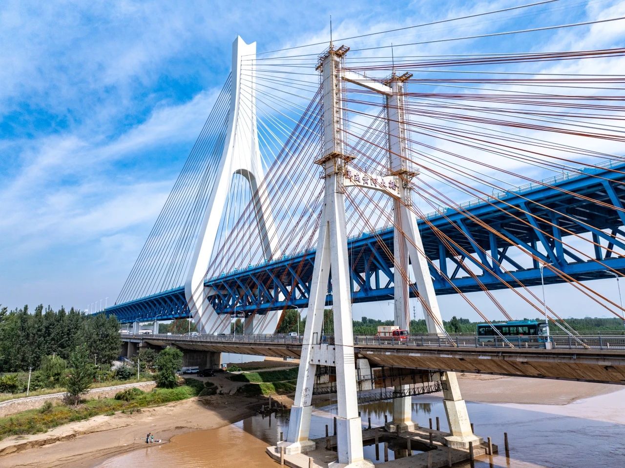 1982年7月,濟(jì)南黃河大橋(老橋)建成通車,作為當(dāng)時亞洲跨徑最大的公路斜拉橋,入選濟(jì)南“1978—1988泉城十大景觀”。如今,新橋與老橋“并肩”相望,成為黃河上第一座不等跨并橋建設(shè)工程,也是黃河上跨徑最大、鋼橋總長最長的公軌分層合建橋梁,刷新“跨黃”橋梁紀(jì)錄。