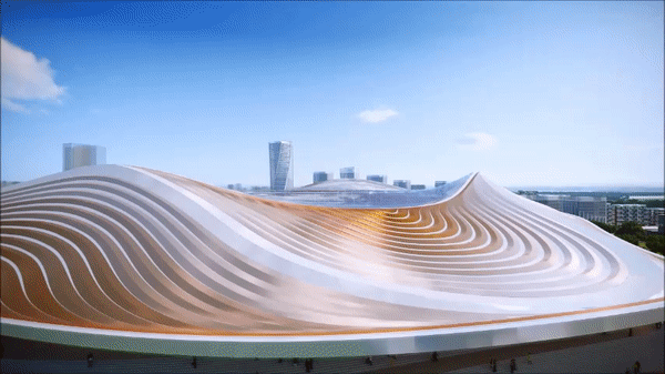 足球場(chǎng)屋蓋結(jié)構(gòu)由鋼結(jié)構(gòu)索膜結(jié)構(gòu)和金屬屋面組成,外輪廓平面近似直徑280m的正圓,中心開(kāi)口平面為長(zhǎng)軸176.5m、短軸156.5m的橢圓,屋頂參考黃河水流設(shè)計(jì),沿環(huán)向呈波浪狀起伏,是世界首個(gè)平面單層膜輪輻式索膜結(jié)構(gòu)體系,也是國(guó)內(nèi)首例大規(guī)模應(yīng)用高透光率PTFE網(wǎng)格膜材料的專業(yè)足球場(chǎng)。