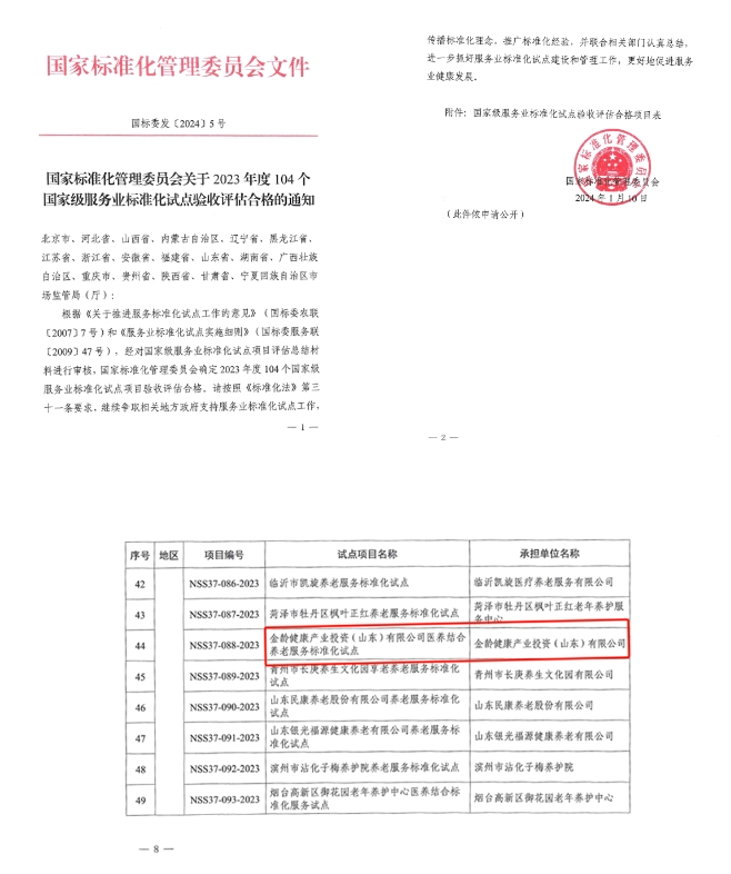 近日,根據(jù)《關(guān)于推進(jìn)服務(wù)標(biāo)準(zhǔn)化試點(diǎn)工作的意見》(國(guó)標(biāo)委農(nóng)聯(lián)[2007]7號(hào))和《服務(wù)業(yè)標(biāo)準(zhǔn)化試點(diǎn)實(shí)施細(xì)則》(國(guó)標(biāo)委服務(wù)聯(lián)[2009]47號(hào)),經(jīng)對(duì)國(guó)家級(jí)服務(wù)業(yè)標(biāo)準(zhǔn)化試點(diǎn)項(xiàng)目評(píng)估總結(jié)材料進(jìn)行審核,國(guó)家標(biāo)準(zhǔn)化管理委員會(huì)確定2023年度104個(gè)國(guó)家級(jí)服務(wù)業(yè)標(biāo)準(zhǔn)化試點(diǎn)項(xiàng)目驗(yàn)收評(píng)估合格,建設(shè)集團(tuán)所屬金齡健康產(chǎn)業(yè)投資(山東)有限公司醫(yī)養(yǎng)結(jié)合養(yǎng)老服務(wù)標(biāo)準(zhǔn)化試點(diǎn)通過(guò)驗(yàn)收。