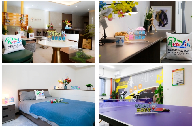 區(qū)別于普通出租公寓、酒店賓館,根據(jù)青年喜好,植入專屬LOGO 、IP形象等青春元素。房間內(nèi)部配備床、衣柜、書桌椅、置物架等,并有獨(dú)立衛(wèi)浴、冷暖供應(yīng),青年可“拎包入住”。公共區(qū)域整體打造自助辦公、學(xué)習(xí)閱讀、運(yùn)動健身、共享會客、休閑娛樂、自助廚房6大功能區(qū),滿足青年日常需求。