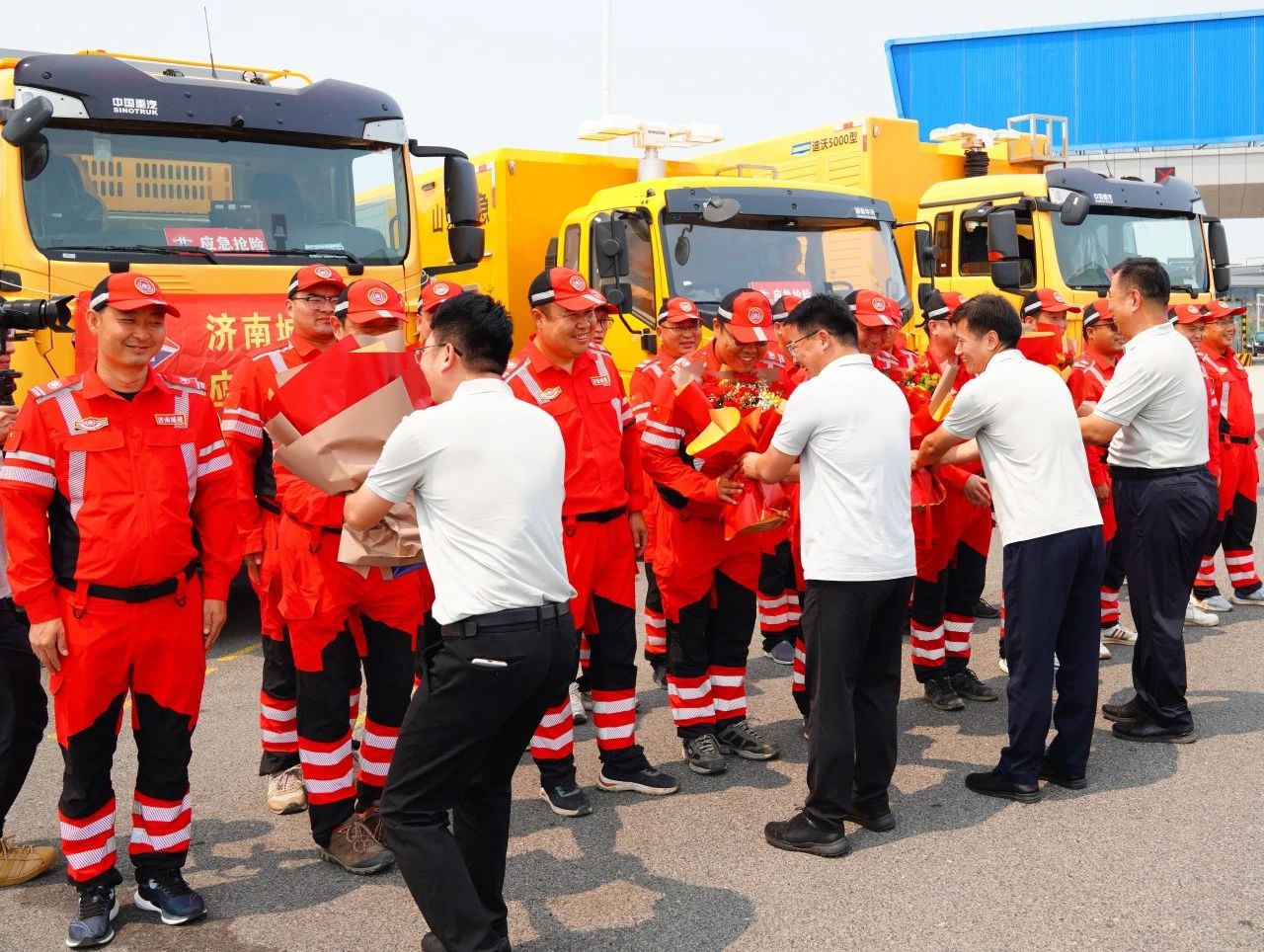 7月11日,馳援臨沂市搶險(xiǎn)救災(zāi)的濟(jì)南城建集團(tuán)公司應(yīng)急救援隊(duì)35名隊(duì)員圓滿完成任務(wù)返回濟(jì)南。