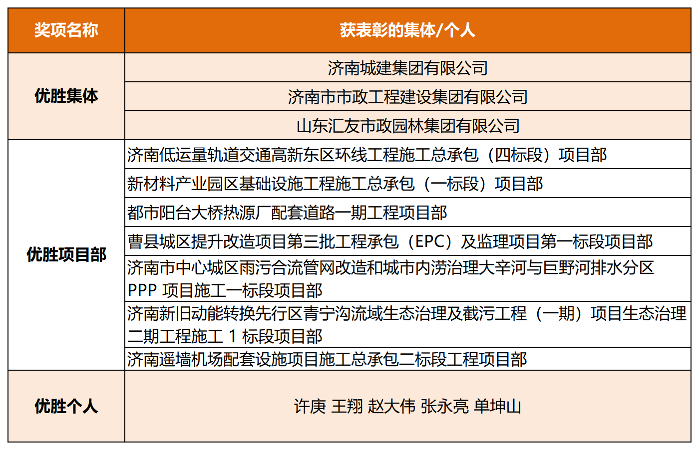 近日,山東省住房和城鄉(xiāng)建設(shè)廳、中共山東省委省直機(jī)關(guān)工作委員會、山東省總工會聯(lián)合發(fā)布《關(guān)于公布2024年度全省住房城鄉(xiāng)建設(shè)系統(tǒng)重點(diǎn)工程“聚焦新質(zhì)生產(chǎn)力 服務(wù)高質(zhì)量發(fā)展”創(chuàng)新創(chuàng)優(yōu)勞動競賽獲獎名單的通知》,建設(shè)集團(tuán)所屬濟(jì)南城建集團(tuán)公司及下屬子公司市政集團(tuán)公司、匯友集團(tuán)公司獲評“優(yōu)勝集體”;城建集團(tuán)公司濟(jì)南低運(yùn)量軌道交通高新東區(qū)環(huán)線工程施工總承包(四標(biāo)段)項(xiàng)目部等7個項(xiàng)目部獲評“優(yōu)勝項(xiàng)目部”;城建集團(tuán)公司5名同志獲評“優(yōu)勝個人”。在競賽調(diào)研濟(jì)南站觀摩會上,城建集團(tuán)公司和市政集團(tuán)公司分別被授予“工人先鋒隊(duì)”“青年突擊隊(duì)”榮譽(yù)旗幟。