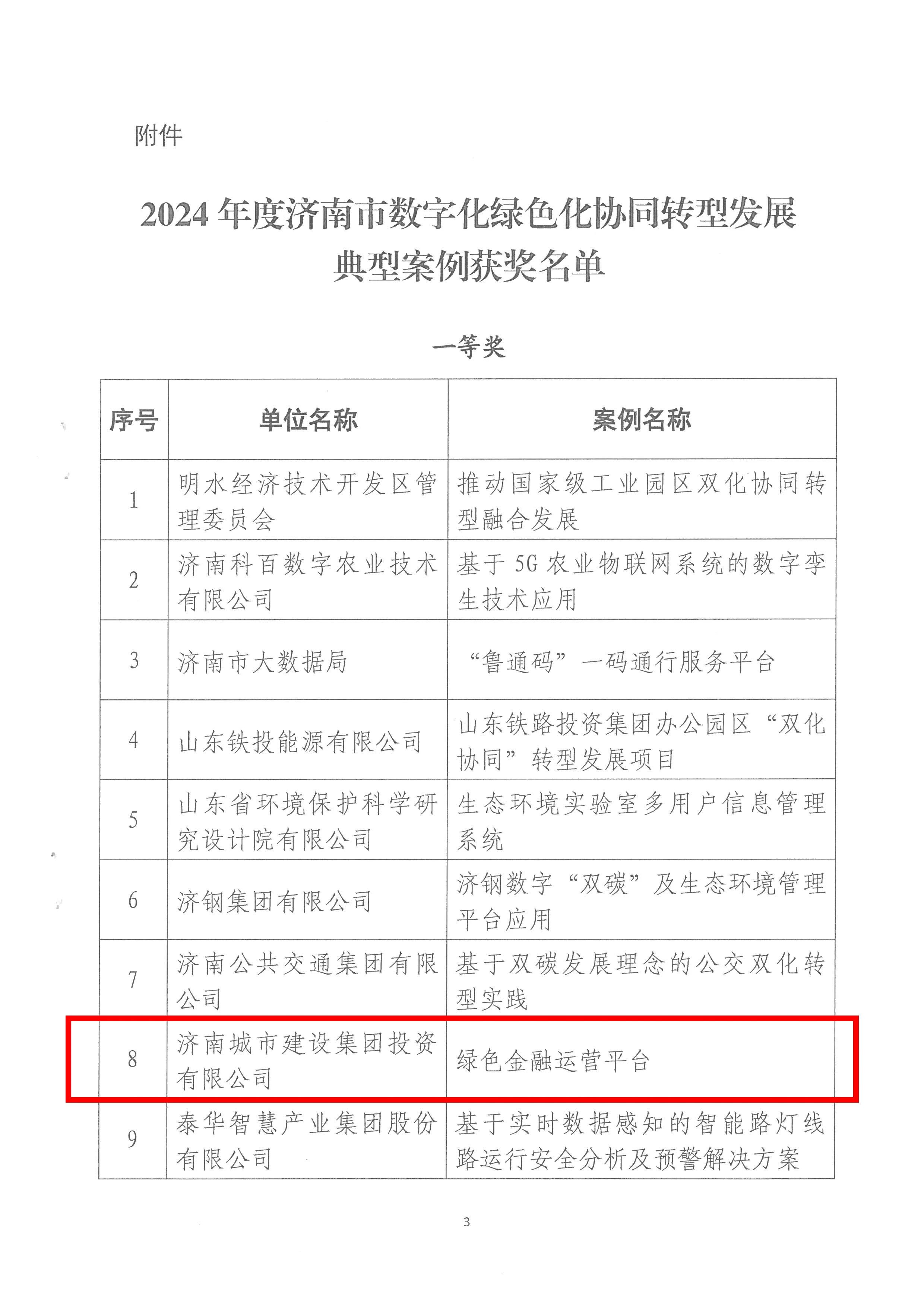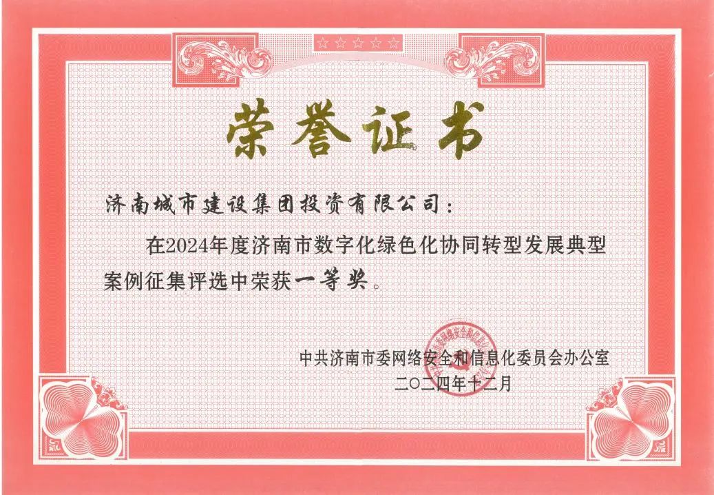 近日,濟(jì)南市委網(wǎng)信辦公布了《2024年度濟(jì)南市數(shù)字化綠色化協(xié)同轉(zhuǎn)型發(fā)展典型案例獲獎(jiǎng)情況的通知》。經(jīng)過嚴(yán)格的考察、評(píng)審與公示,建設(shè)集團(tuán)所屬濟(jì)南城市建設(shè)集團(tuán)投資有限公司提交的“綠色金融協(xié)同賦能平臺(tái)”案例在眾多參評(píng)項(xiàng)目中脫穎而出,榮獲一等獎(jiǎng)。