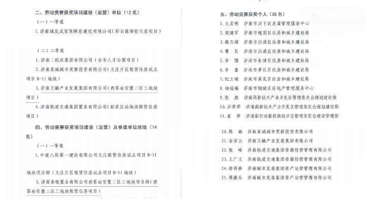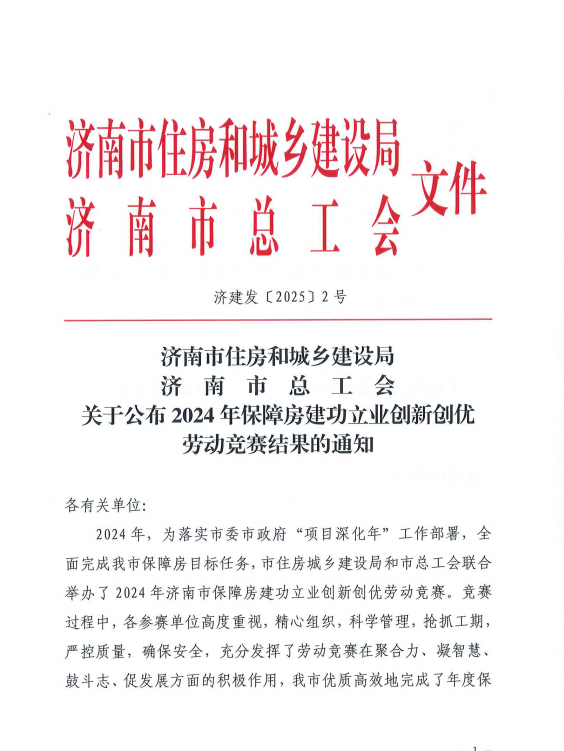 近日,濟南市住建局、市總工會公布2024年保障房建功立業(yè)創(chuàng)新創(chuàng)優(yōu)勞動競賽結(jié)果的通知,建設(shè)集團所屬濟南萬融產(chǎn)業(yè)發(fā)展集團有限公司榮獲項目建設(shè)(運營)單位二等獎、公司職工金宗云獲評先進個人,萬融集團所屬濟南春曉置業(yè)有限公司西客站安置二區(qū)三地塊項目部榮獲項目建設(shè)(運營)及參建單位班組一等獎。